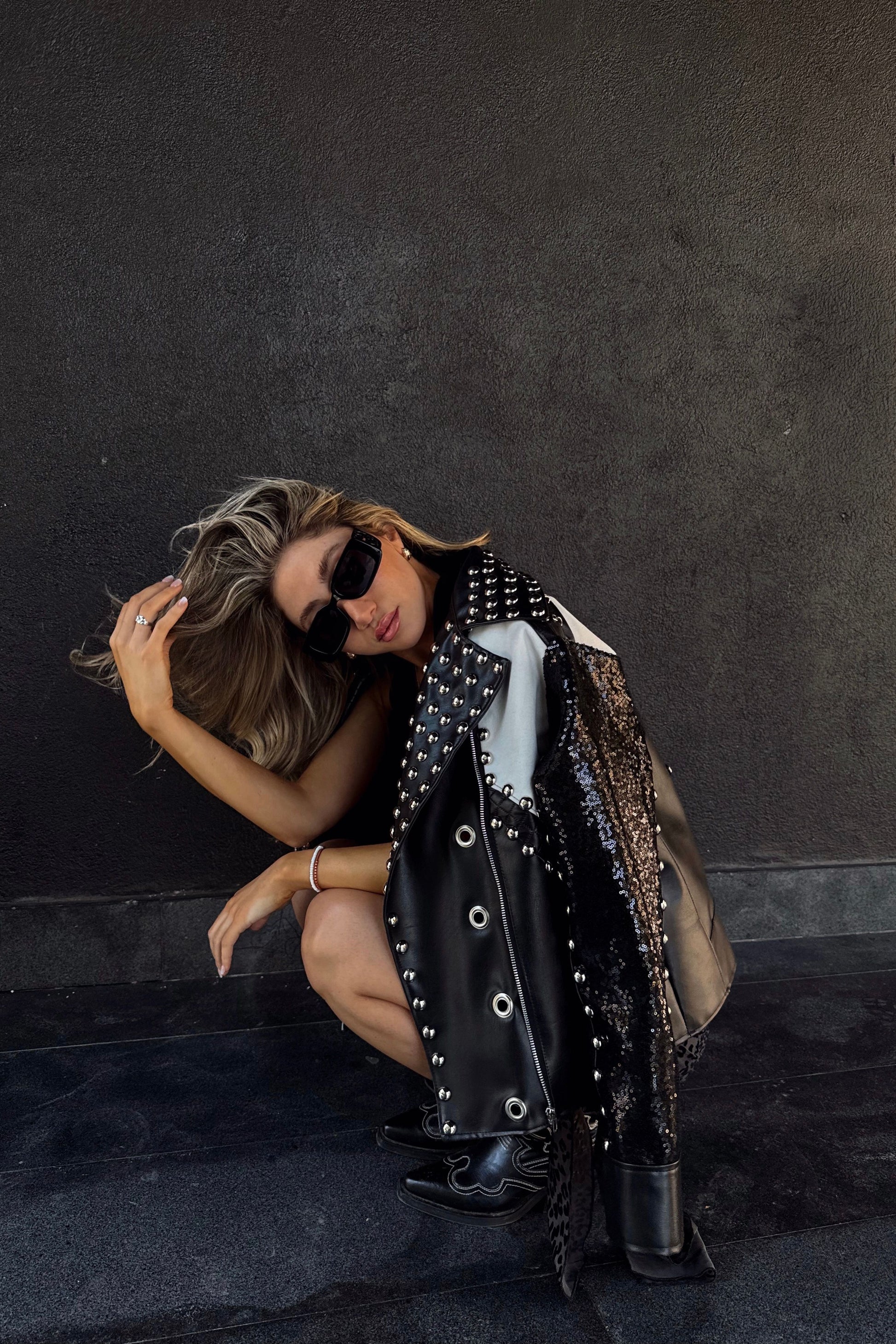 La Chaqueta Biker Coachella dark de la Colección Primavera–Verano 2026 reinterpreta el clásico calce biker en versión oversize, confeccionada en cuerina vegana en tonos negro y blanco. Presenta detalles en cuerina quilt y lentejuelas en mangas y más de 200 tachas aplicadas a mano una a una, que reflejan el sello artesanal y distintivo de la marca. Con forro 100% poliéster, es una chaqueta liviana ideal para la temporada primaveral, perfecta para elevar tus outfits de festivales, sunsets, eventos o combinada con denim en looks casuales. Inspirada en la tendencia western festivalera, esta pieza refleja la esencia libre, atrevida y única de la marca.