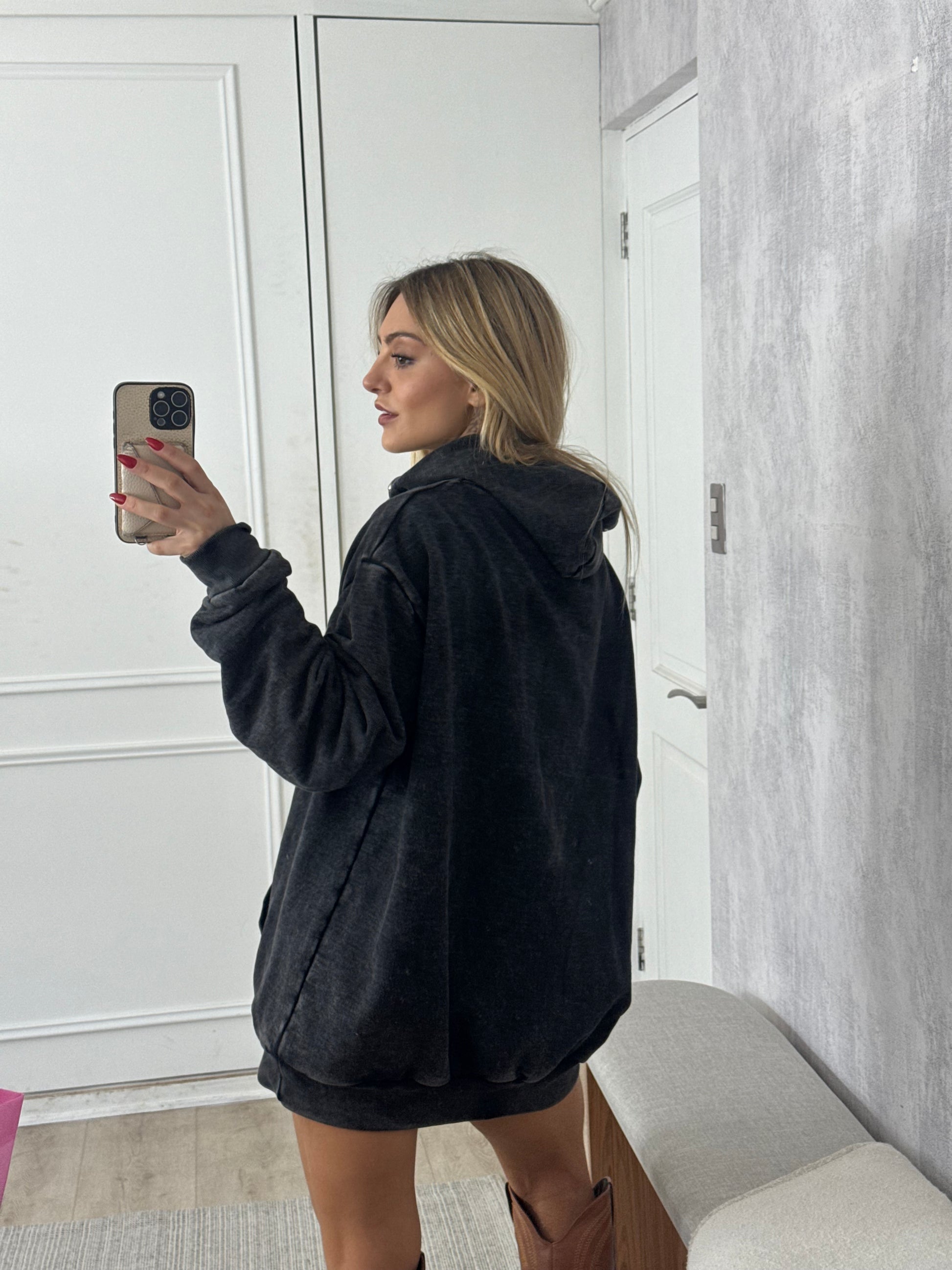 Parte del avance Primavera-Verano 2026, esta pieza tiene calce OVERSIZE, con tachas niqueladas en tonos plateados en gorro y bolsillo canguro, esta confeccionado en franela nacional 100% algodón cardada con un lavado desgastado, esta versión es sin lentejuelas para un look más básico pero igualmente canchero. Estampado frontal "mind your business".