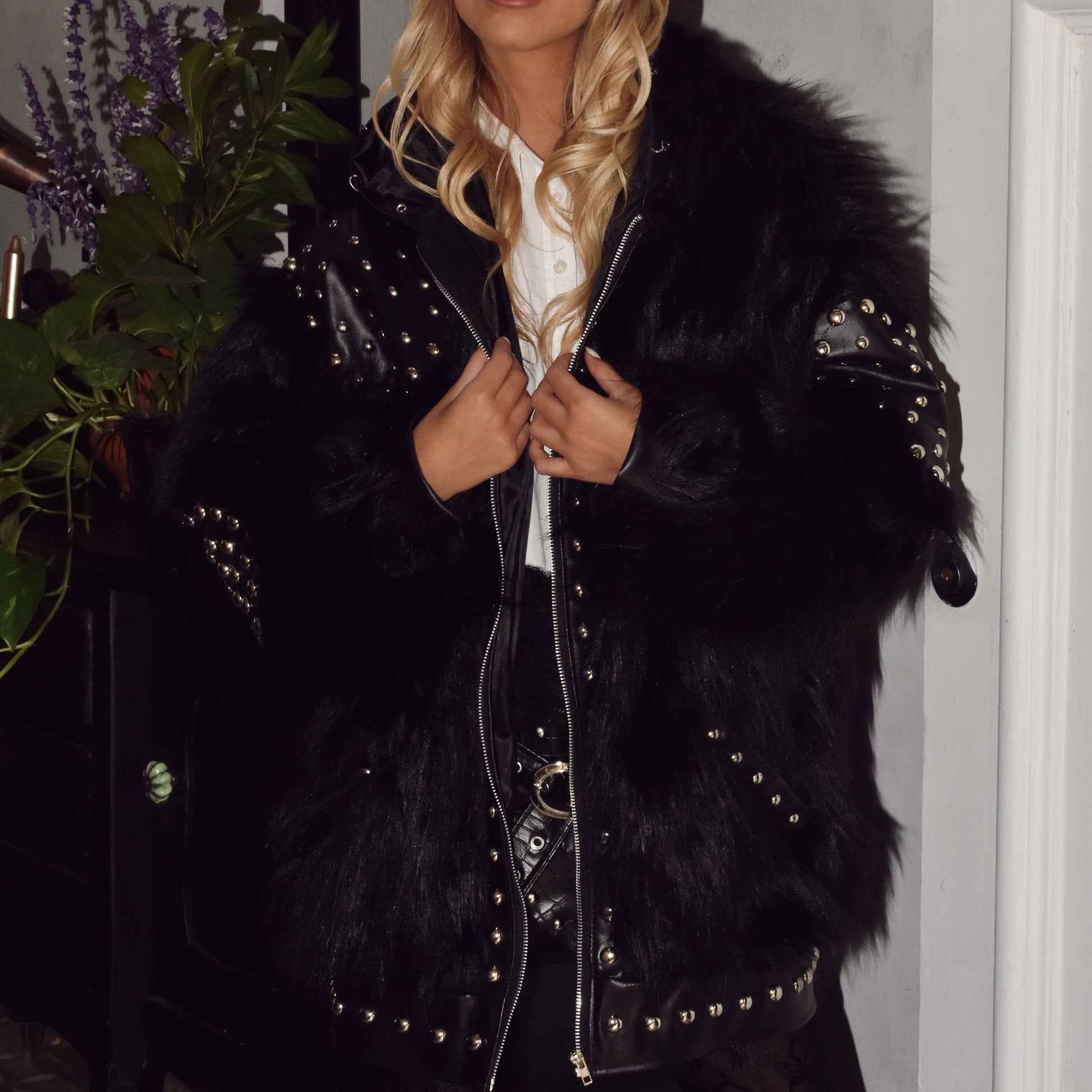 Abrigo piel Berlín pertenece a la nueva colección Otoño Invierno 2025, fabricada en piel sintética larga en el clásico black, con aplicaciones de cuero vegano + de 200 tachas, cierre, capucha y bolsillos laterales.